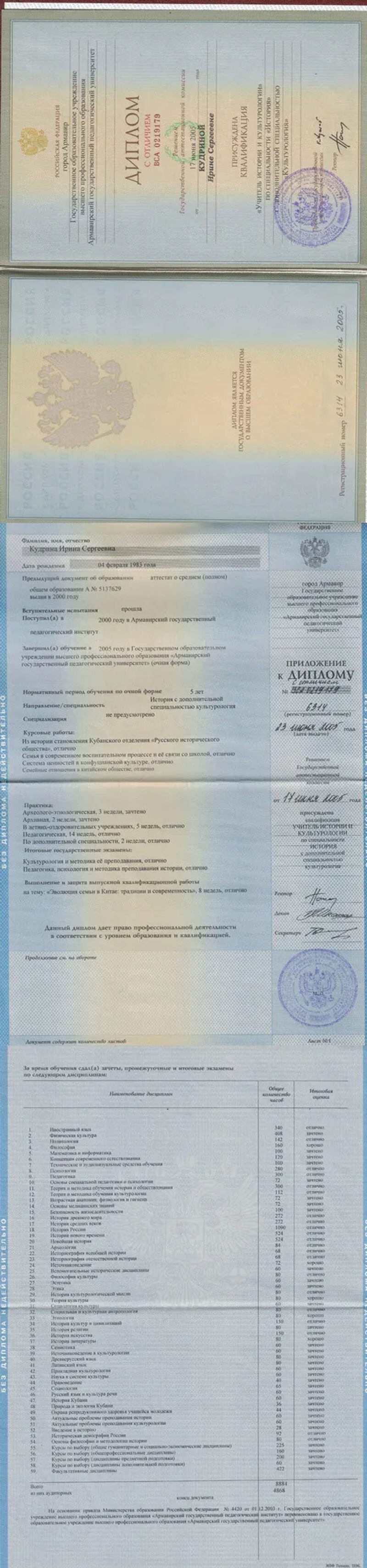 - Армавирский государственный педагогический университет, исторический факультет, специальность «Истории с дополнительной специальностью культурология», 2000–2005 гг.