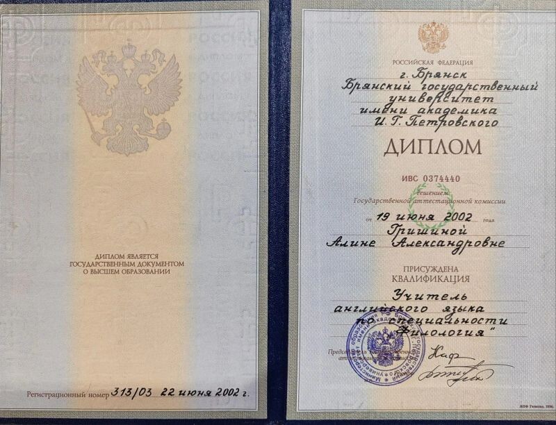 - Брянский государственный университет имени академика И.Г. Петровского, учитель английского языка, 1997–2002 гг.