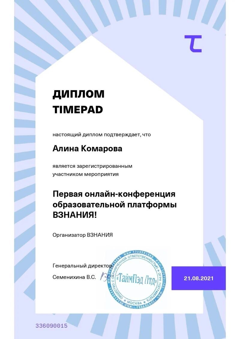 - ТаймПэд Лтд, Первая онлайн-конференция образовательной платформы «ВЗНАНИЯ», 2021 г.