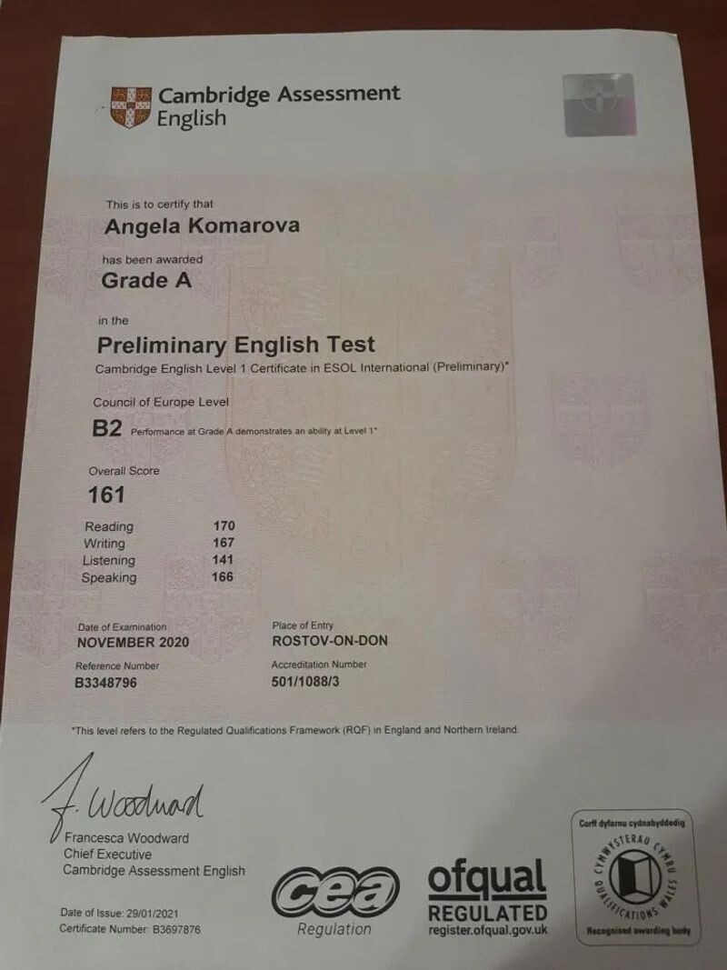 - Кембриджский сертификат, уровень В2, 2020 г.