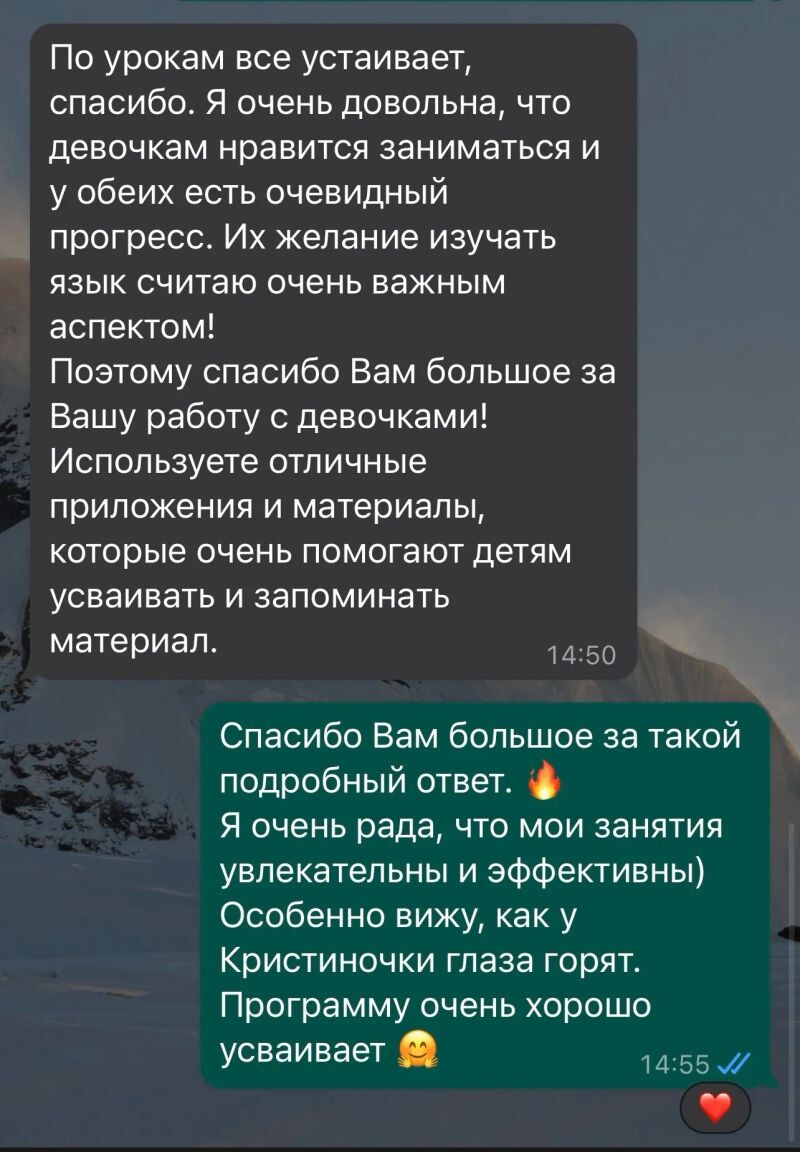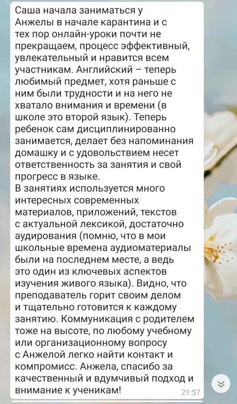 Дочке нравится заниматься с Анжелой Вячеславовной. В школе улучшилась успеваемость по английскому. Появился интерес к изучению языка. Рекомендую занятия с Анжелой Вячеславовной!