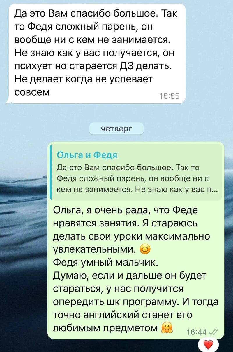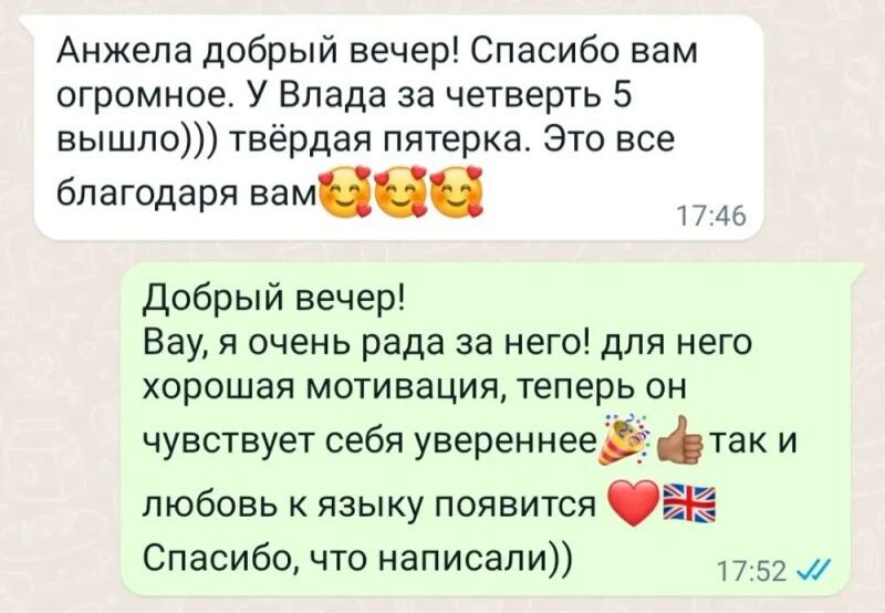 Выражаю огромную благодарность Анжеле Вячеславовне!!! Самый лучший педагог!!! Были сложности в школе с Английским языком 4 класс, после онлайн занятий с этим преподавателем оценки стали 4 и 5, а были тройки. Внуку стал нравится Английский, в школе преподаватель его не узнает, знания стали лучше, произношение совсем другое !!! Очень рада что нашла такого квалифицированного педагога, который смог найти подход к моему внуку!!!