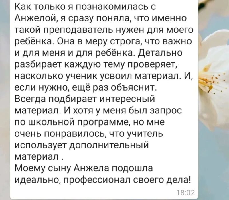 Очень долго не могли подобрать преподавателя,у ребенка не было интереса к языку, оттуда и сложности в изучение. С Анжелой Вячеславовной контакт сложился с первого урока, ребенок с удовольствием занимается,а самое главное виден результат!