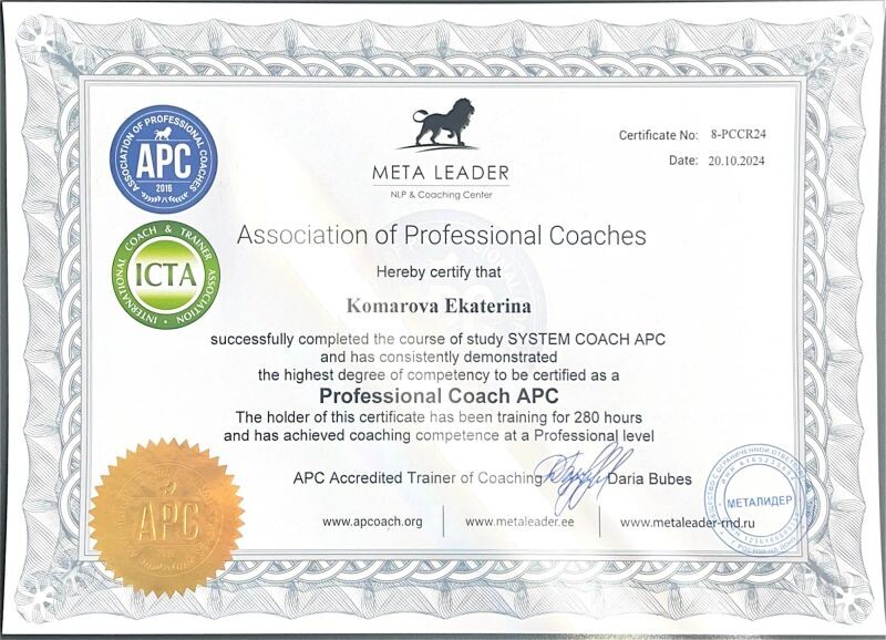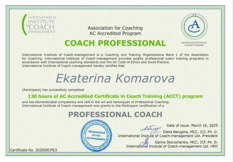 - Профессиональный командный и бизнес-коуч, сертифицированный международными ассоциациями АС, ICF, APC — 1 год.