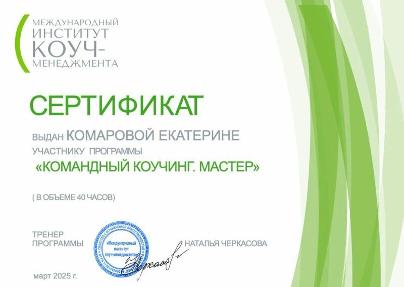 - "Международный Институт Коуч-Менеджмента" по программе "Командный Коучинг. Мастер", 2025 г.