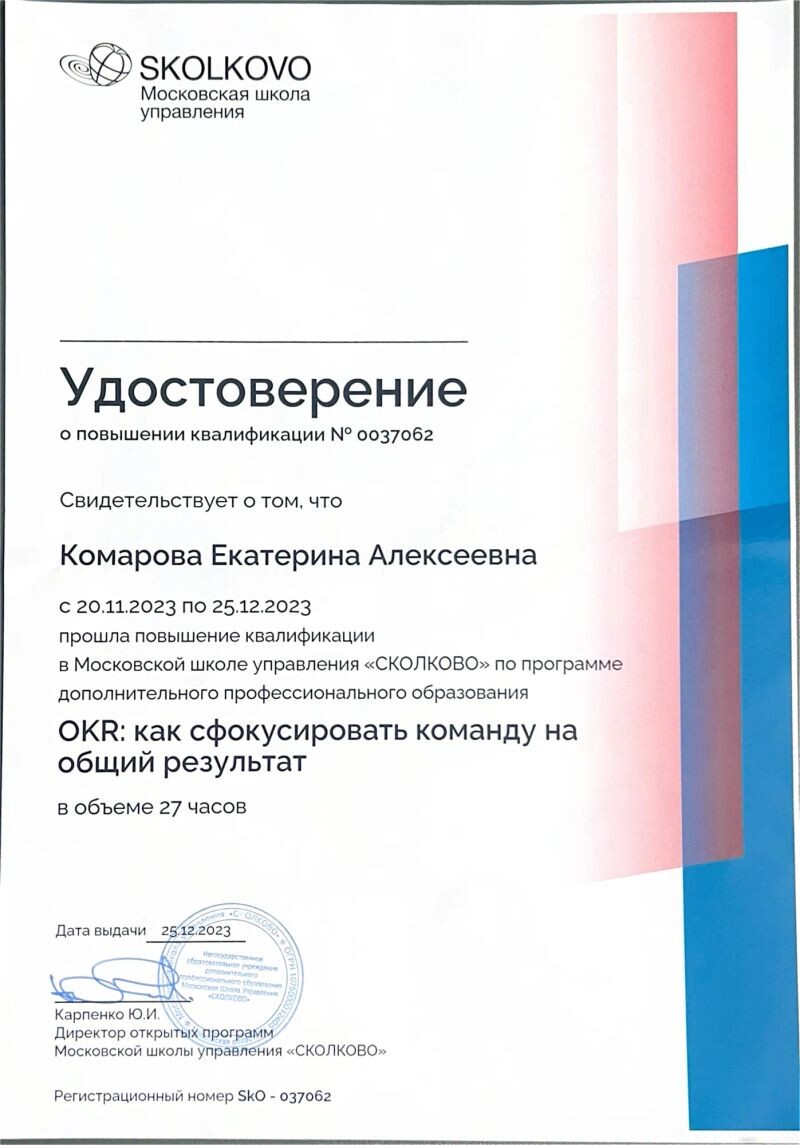 - Московская школа управления СКОЛКОВО, по программе: "OKR: Как сфокусировать команду на результат", 2023 г.