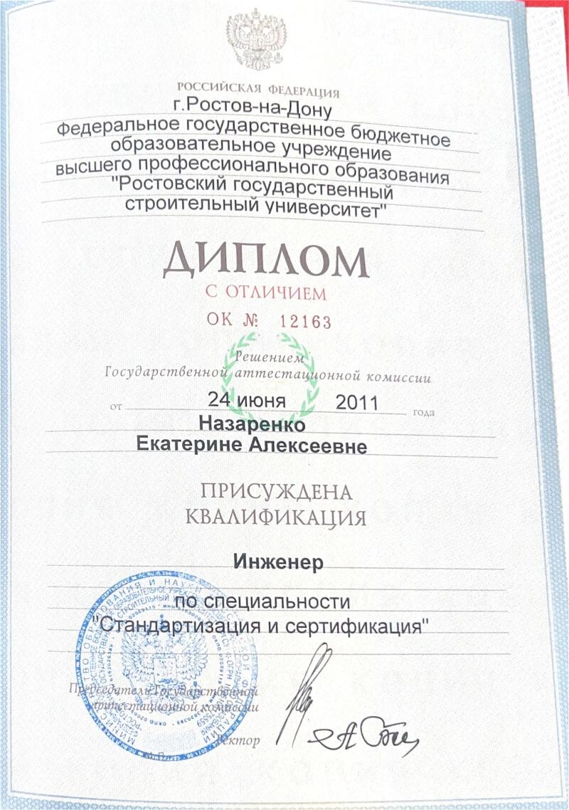 - ФГБОУВПО "Ростовский Госудраственный Строительный Университет", квалификация Инженер по специальности "Стандартизация и сертификация", 2006–2011 гг.