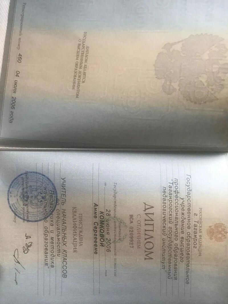 - Таганрогский институт им. А.П. Чехова, факультет педагогики и методики начального образования, специальность – учитель начальных классов, 2001–2006 гг.