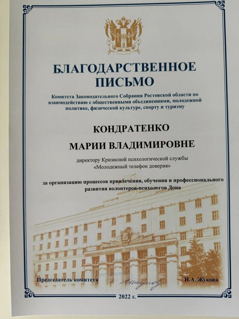 - Комитет Законодательного собрания Ростовской области по взаимодействию с общественными объединениями, молодёжной политике, физической культуре, спорту и туризму, благодарственное письмо за организацию привлечения, обучения волонтёров-психологов Дона, 2022 г.