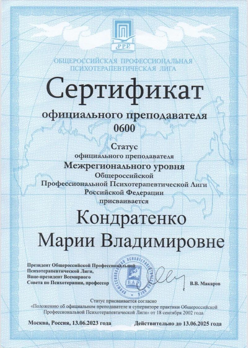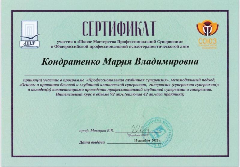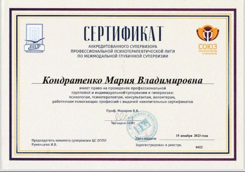 - Сертификат подтверждает аккредитацию в качестве супервизора в ОППЛ и дает возможность проводить в том числе учебную супервизию (с занесением в учетную книжку) в мультимодальном подходе (с 2023 г.).