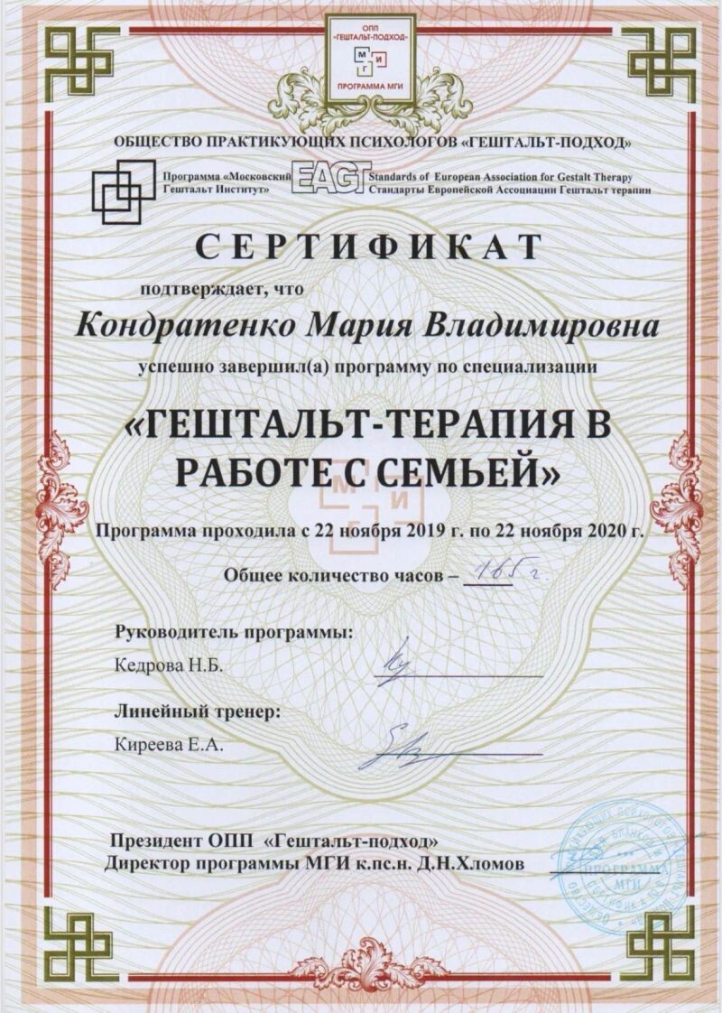 - ОПП «Гештальт-подход», МГИ, программа «Гештальт-терапия в работе с семьёй», 2019–2020 гг.