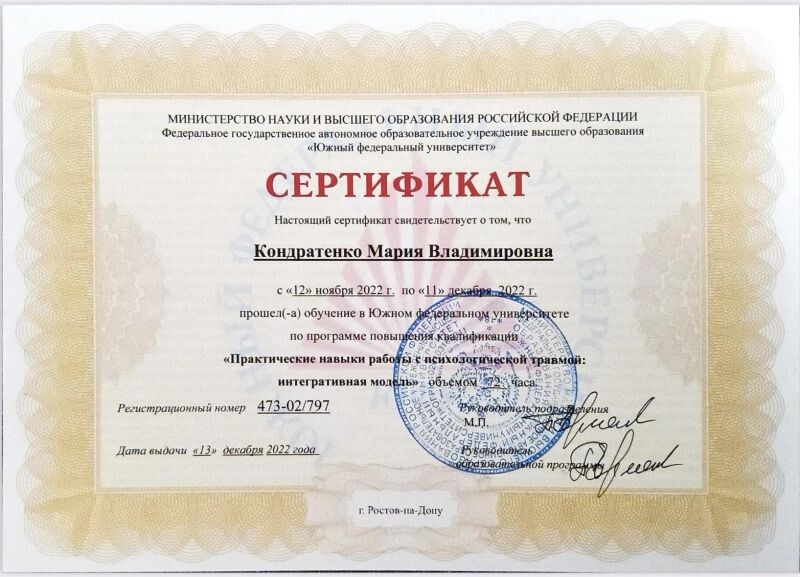 - Южный федеральный университет, программа «Практические навыки работы с психологической травмой: интегративная модель», 2022 г.