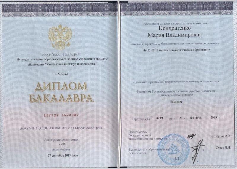 - Московский институт психоанализа, психолог-педагог, 2015–2019 гг.