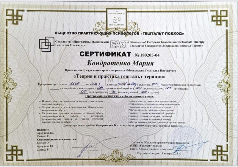 - Являюсь аккредитованным и сертифицированным гештальт-терапевтом в ОПП ГП. Данные представлены в онлайн-реестре на сайте МГИ (с 2023 г.).