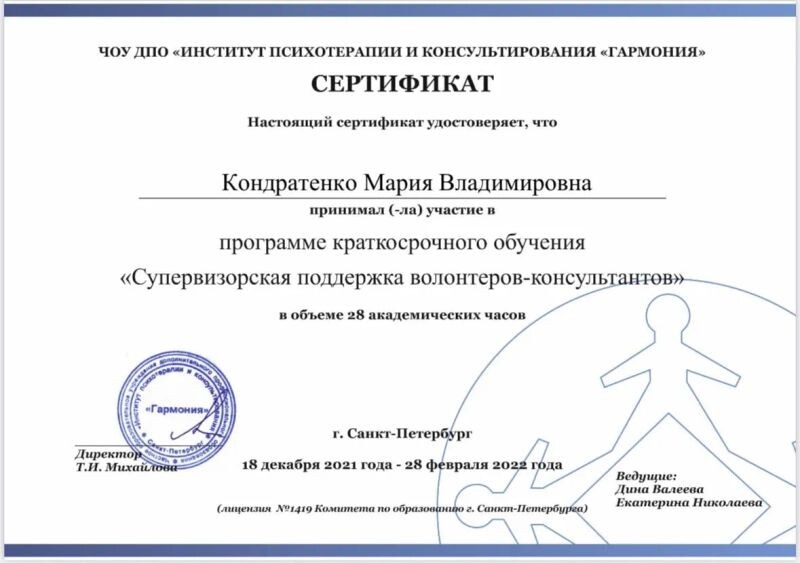 - ЧОУ ДПО «Институт психотерапии и консультирования «Гармония». Супервизорская поддержка волонтеров-консультантов, 2021–2022 гг.