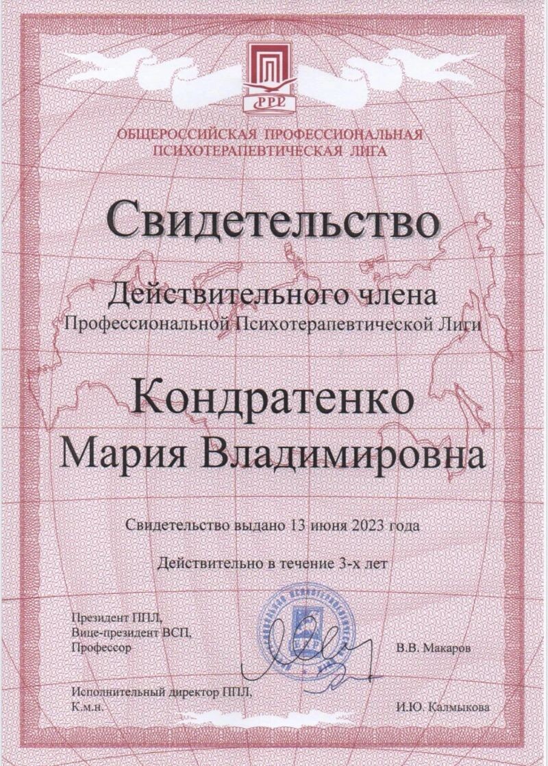 - Общероссийская профессиональная психотерапевтическая лига, действительный член (действительно до 13 июня 2026 года) (с 2023 г.).