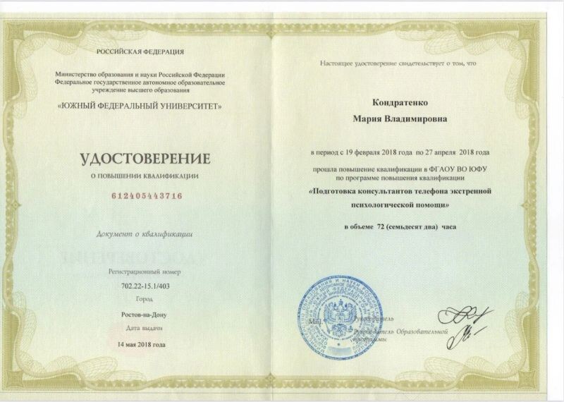 - Южный федеральный университет, программа «Подготовка консультантов телефона экстренной психологической помощи», 2018 г.
