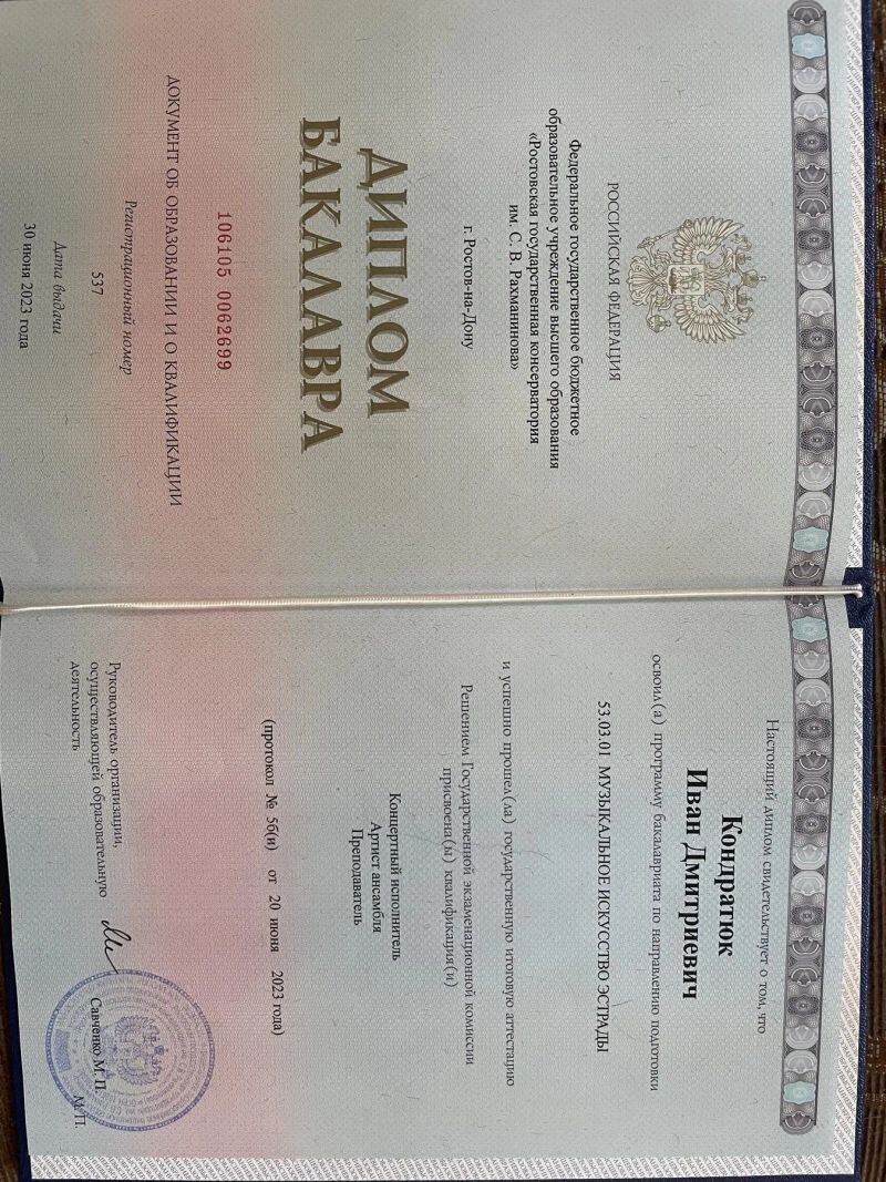 - Ростовская государственная консерватория им. С.В. Рахманинова, направление «Музыкальное искусство эстрады», квалификация «концертный исполнитель, артист ансамбля, преподаватель», 2018–2023 гг.