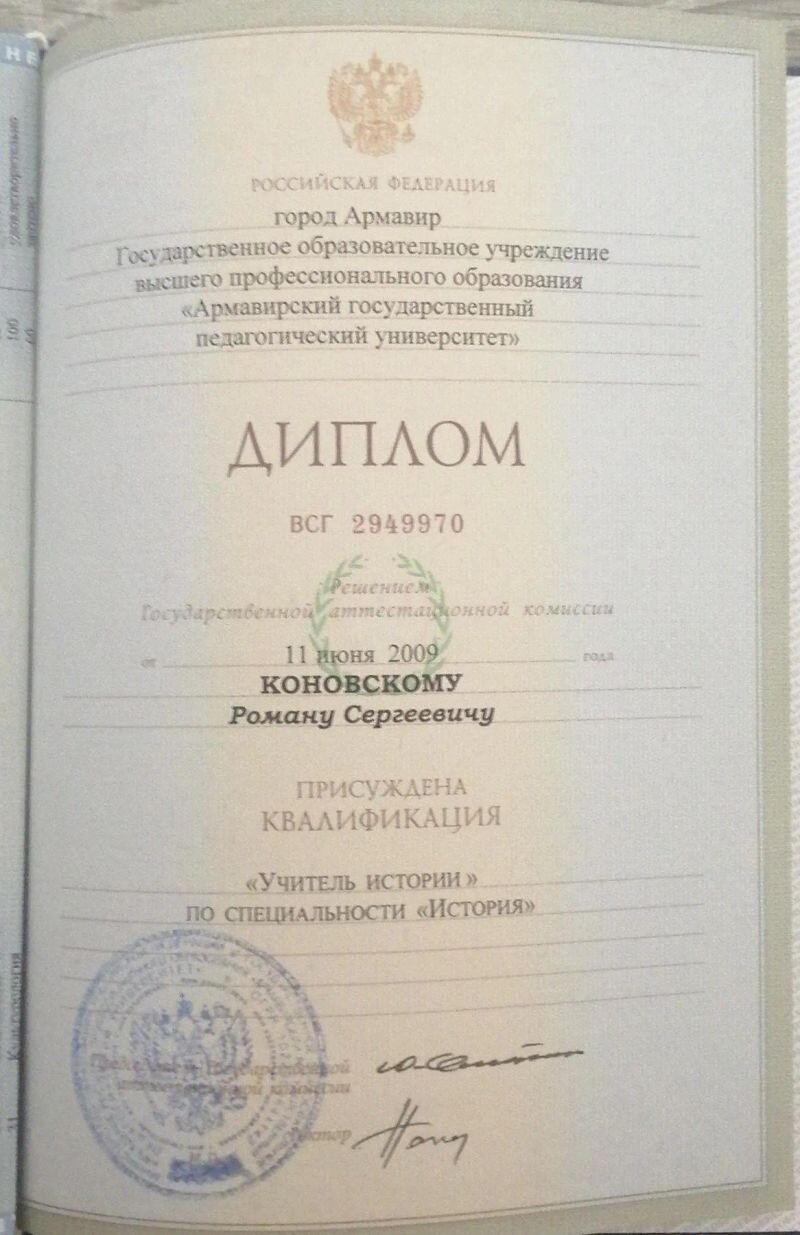 - ГОУ ВПО «Армавирский государственный педагогический университет», квалификация «учитель истории», по специальности «история», 2009 г.