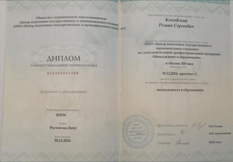 - Центр подготовки государственных и муниципальных служащих, профессиональная переподготовка по программе «Менеджмент в образовании», 2016 г.