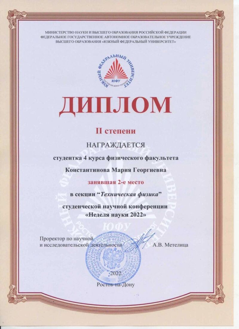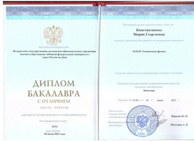 - ЮФУ, физический факультет, техническая физика, 2018–2022 гг.