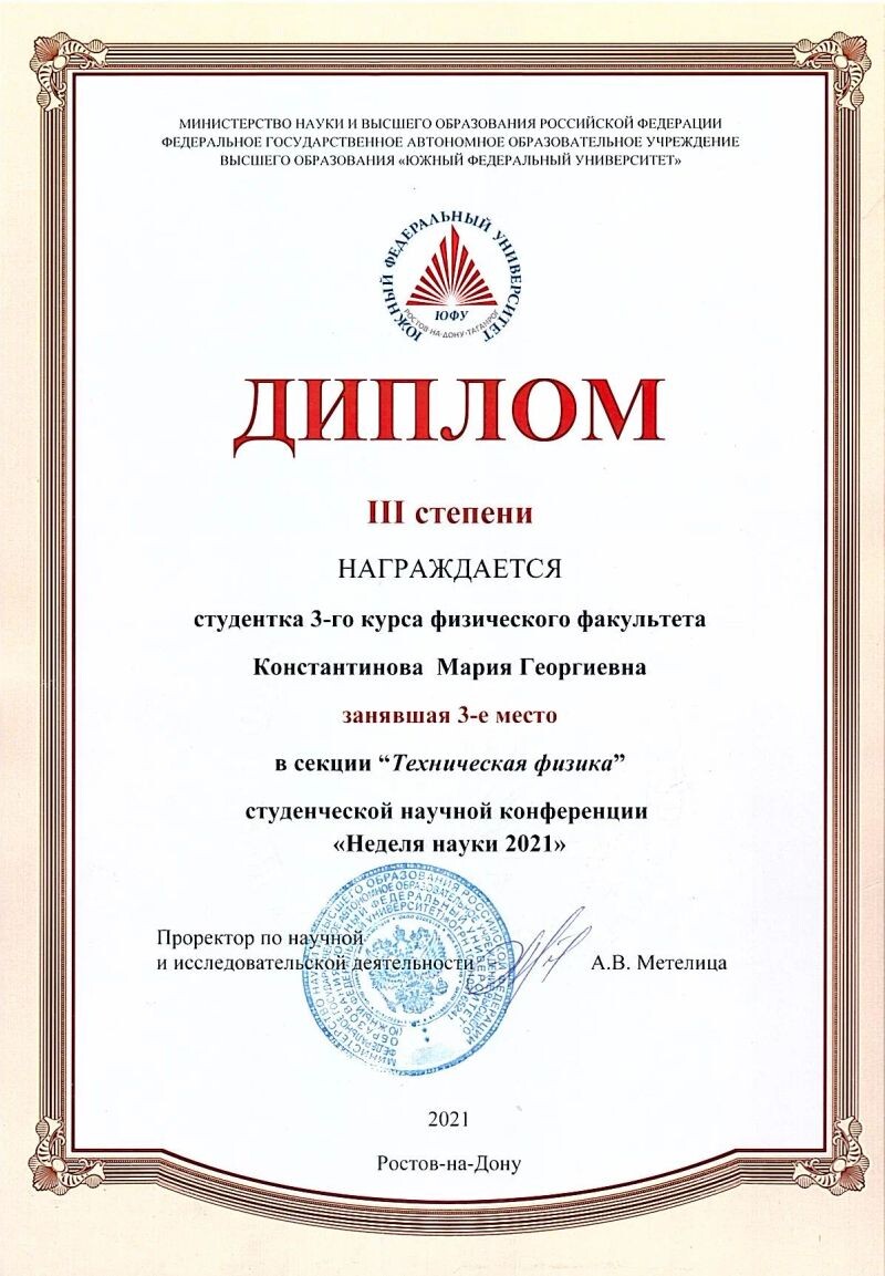 - Диплом, полученный на студенческой конферециии (с 2021 г.).