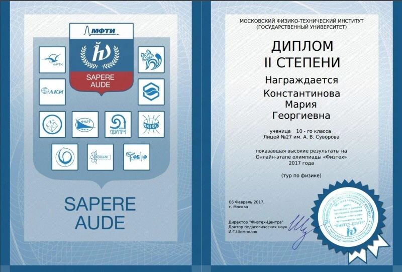 - Диплом олимпиады МФТИ (с 2017 г.).