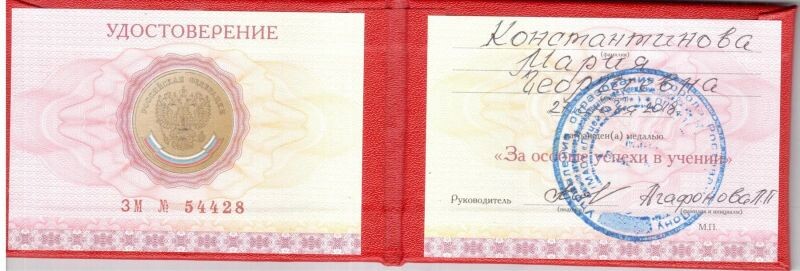 - Удостоверение медали «за особые успехи в учебе» (с 2018 г.).