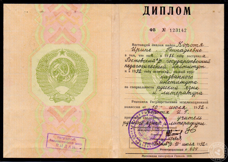 - РГПУ (ЮФУ), филологический факультет, специальность – преподаватель русского языка и литературы, 1992 г.
