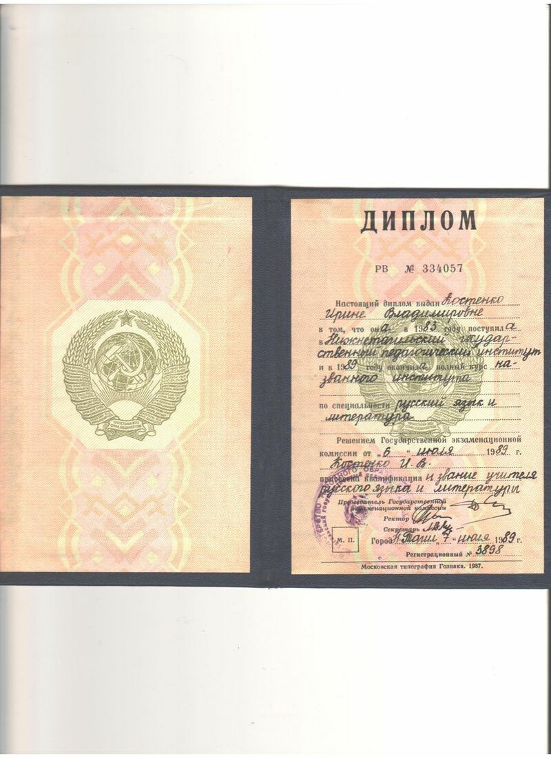 - Нижнетагильский государственный педагогический институт, специальность «русский язык и литература», квалификация «учитель русского языка и литературы», 1989 г.