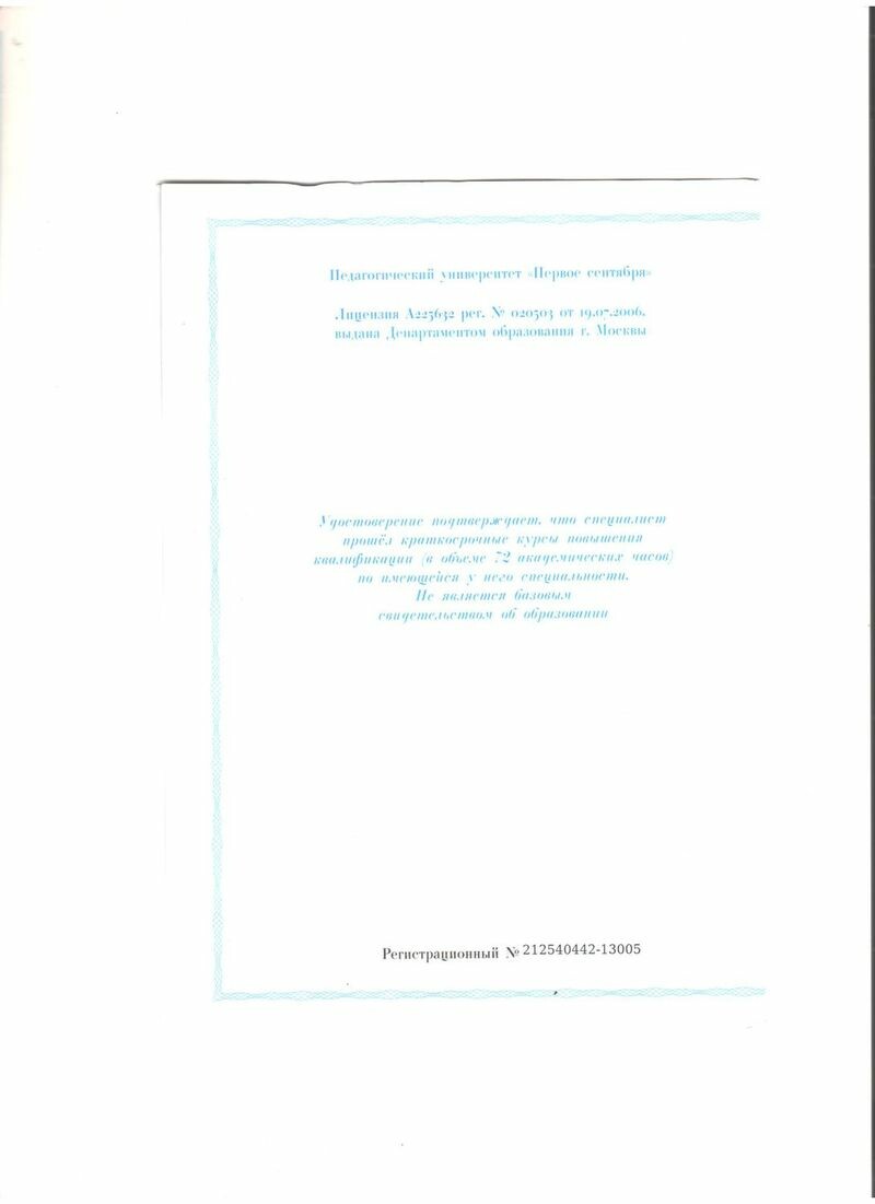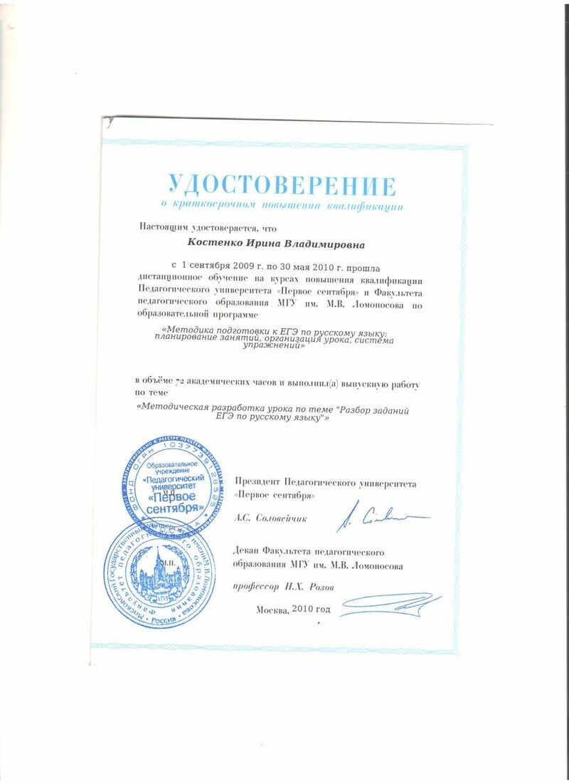 - Педагогический университет «Первое сентября», Факультет педагогического образования МГУ им. М.В. Ломоносова, повышение квалификации по программе «Методика подготовки к ЕГЭ по русскому языку: планирование занятий, организация урока, система упражнений», 2010 г.
