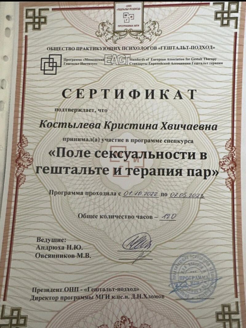 - ОПП «Гештальт-подход», Московский гештальт институт, программа «Гештальт-терапия с семьями», 2023–2024 гг.
