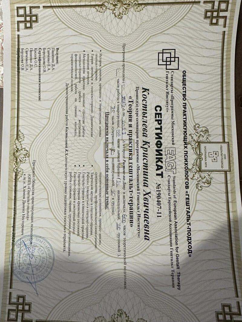 - Московский гештальт институт, курс «Теория и практика гештальт-терапии», 2019–2023 гг.