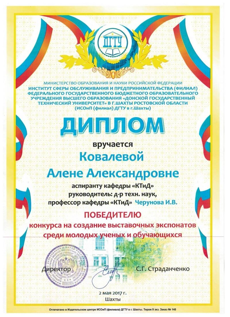 - Диплом победителя конкурса создания выставочных экспонатов среди молодых ученых и обучающихся (с 2017 г.).