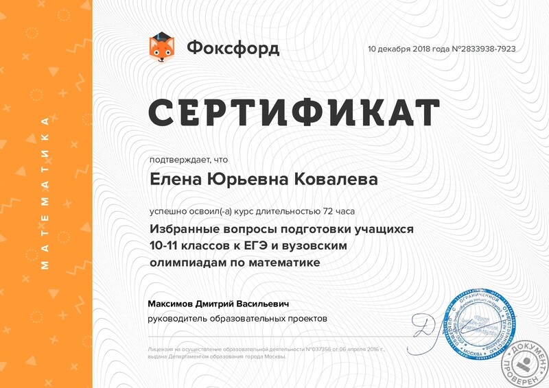 - ООО «Фоксфорд», курс «Избранные вопросы подготовки учащихся 10-11 классов к ЕГЭ и вузовским олимпиадам по математике», 2020 г.
