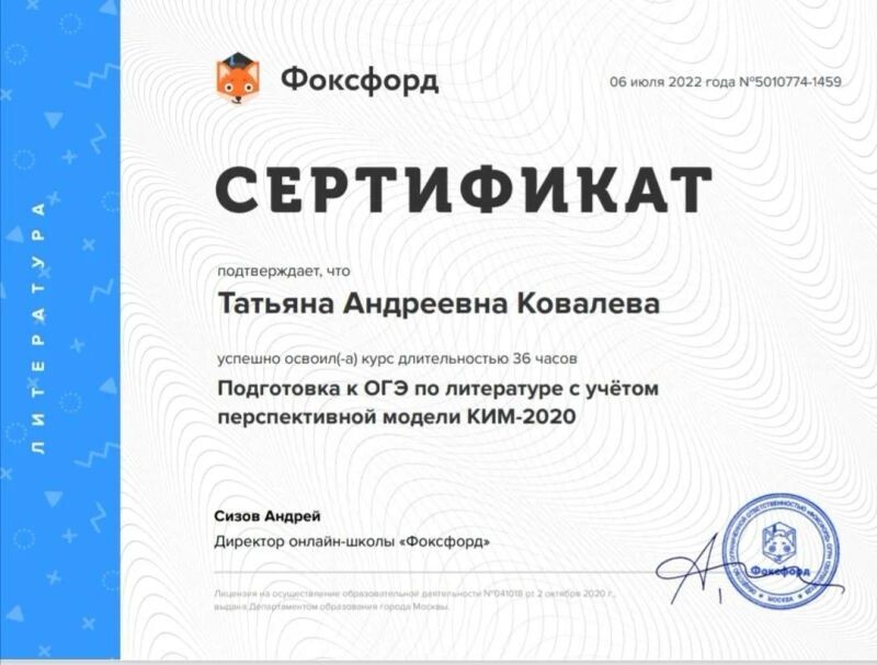 - Фоксфорд, подготовка к ОГЭ по литературе с учётом перспективной модели КИМ-2020, 2022 г.