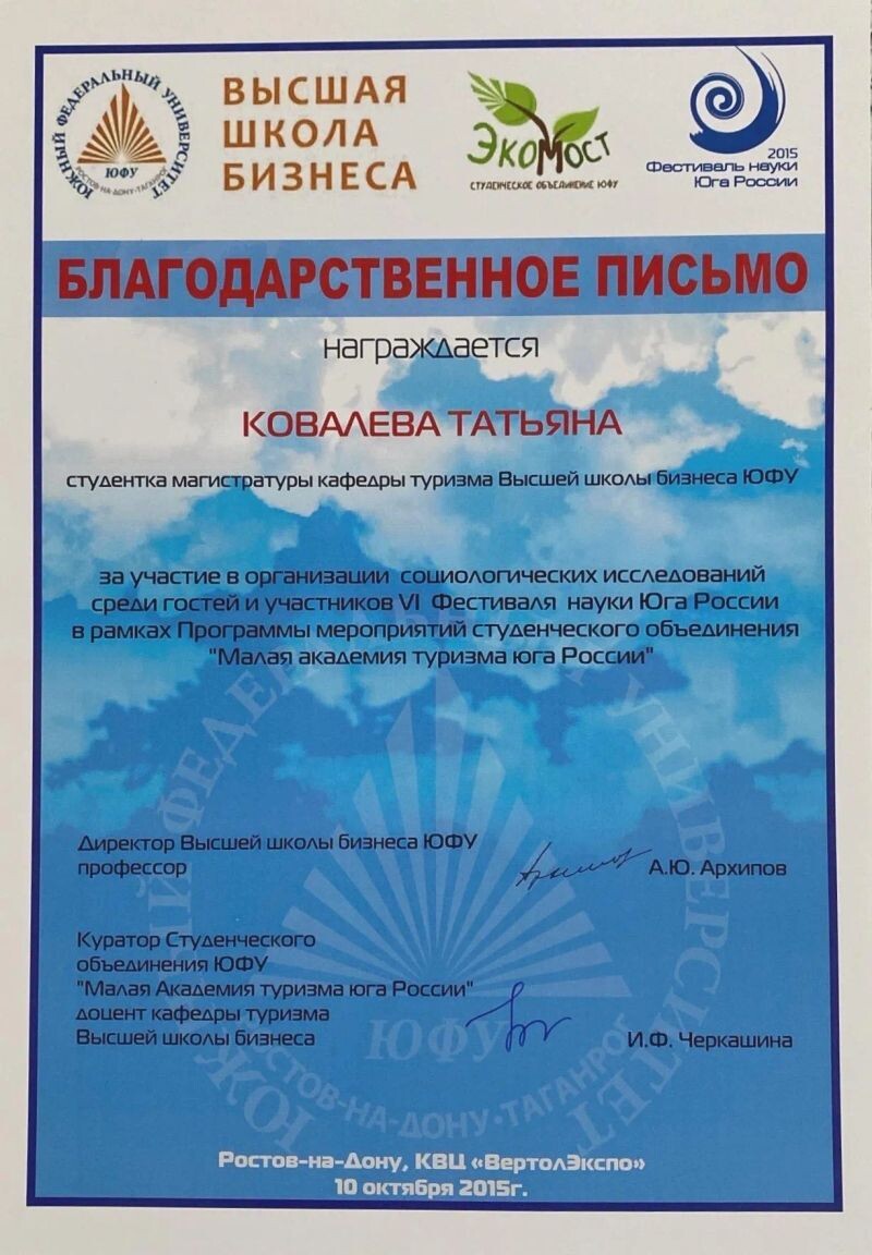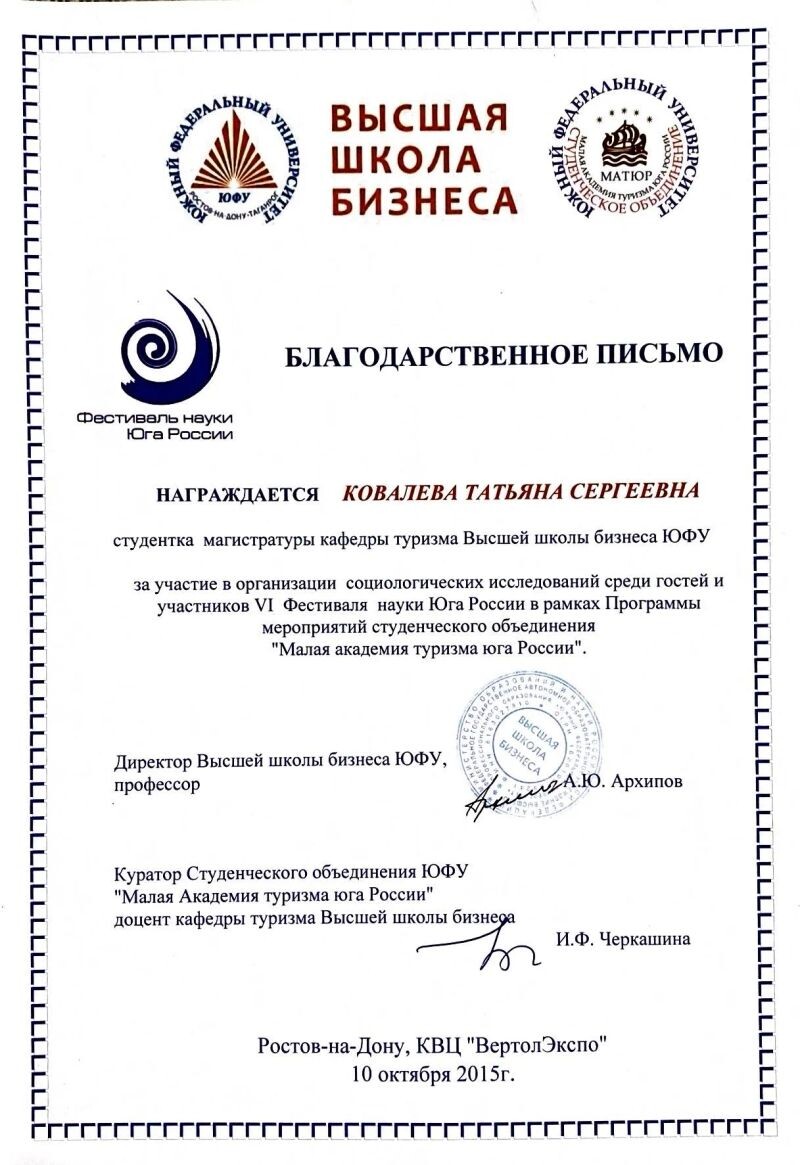 - Высшая школа бизнеса ЮФУ, благодарственное письмо за участие в организации социологических исследований VI Фестиваля науки Юга России, 2015 г.