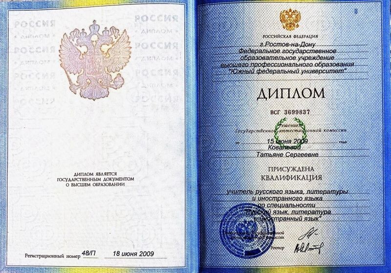 - ЮФУ, русский язык, литература и иностранный язык, 2009 г.