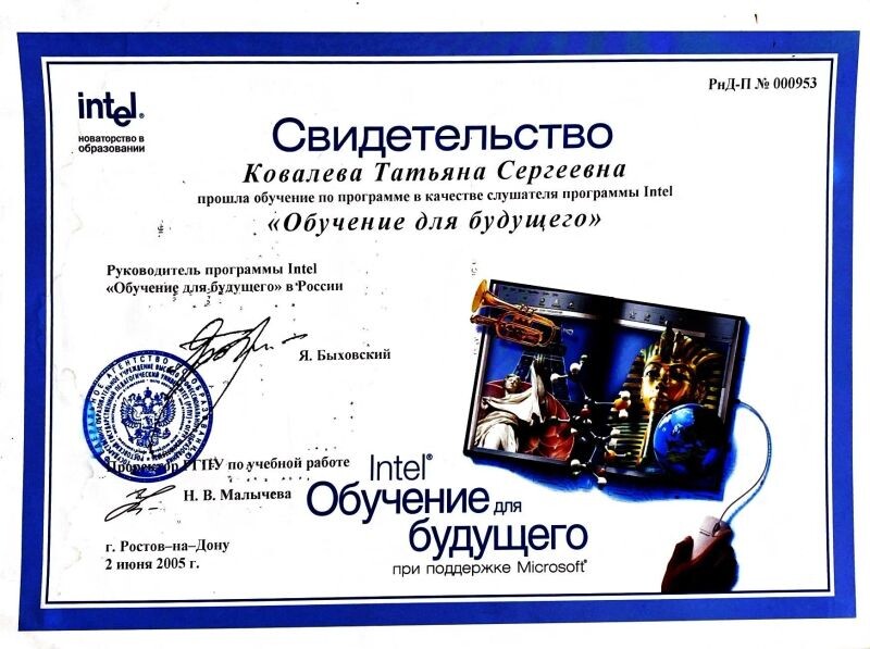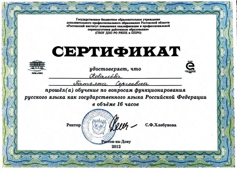 - Ростовский институт повышения квалификации и профессиональной переподготовки работников образования, обучение по вопросам функционирования русского языка как государственного языка Российский Федерации, 2012 г.