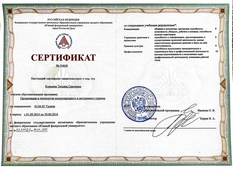- ЮФУ, программа «Организация и технология международного и внутреннего туризма», 2014–2016 гг.