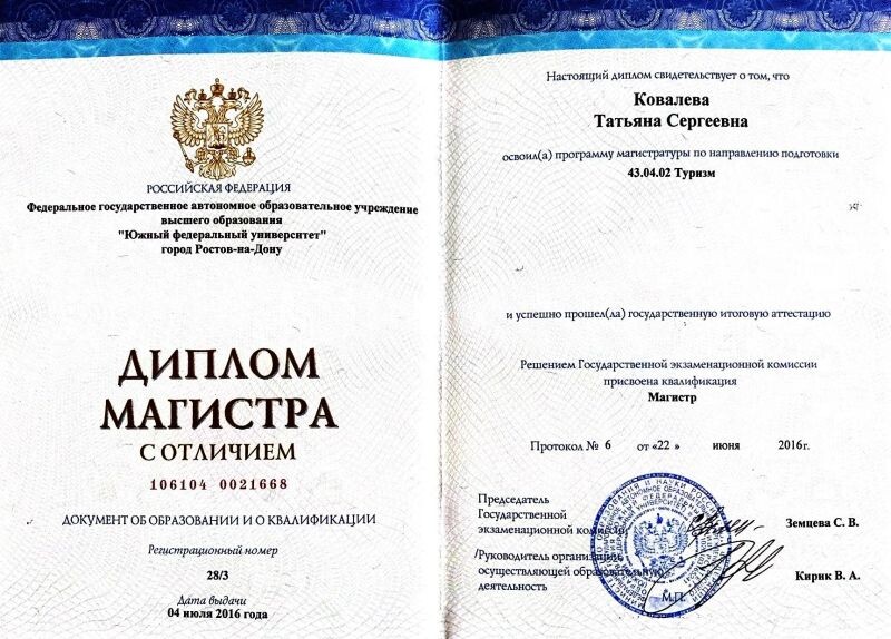 - Магистратура по направлению «организация и технология международного и внутреннего туризма», диплом с отличием, 2014–2016 гг.