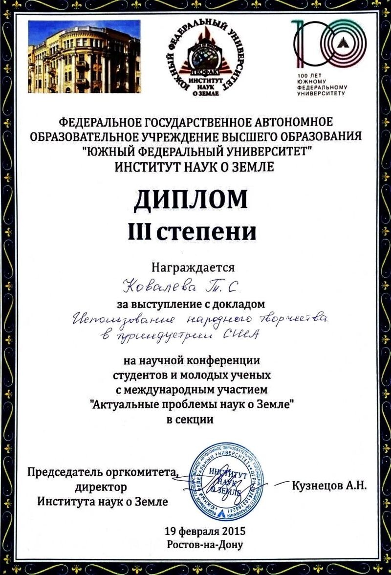- Научная конференция студентов и молодых учёных с международным участием «Актуальные проблемы наук о Земле», докладчик, диплом III степени, 2015 г.