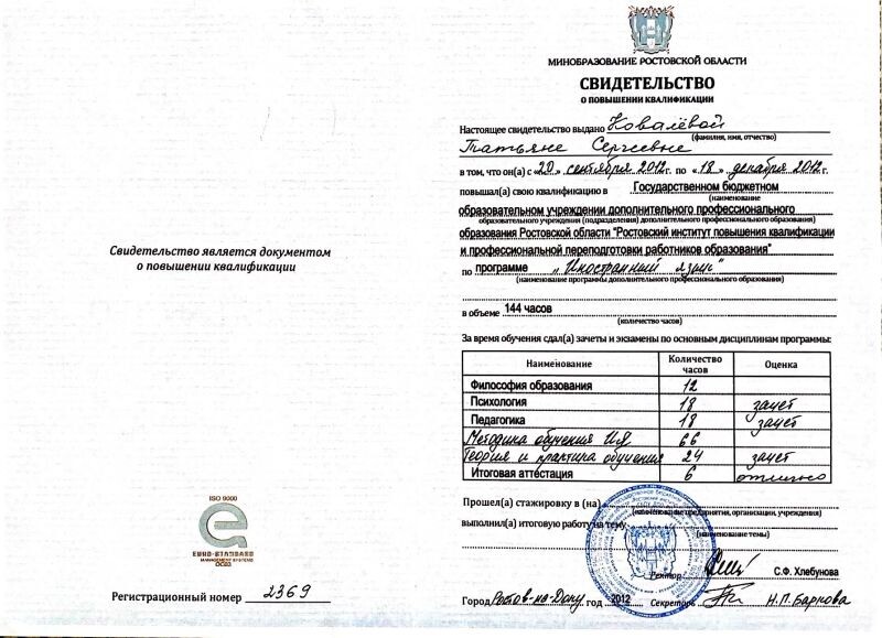 - Ростовский институт повышения квалификации и профессиональной переподготовки работников образования, программа «Иностранный язык», 2012 г.
