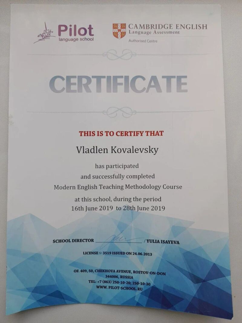 - Языковая школа «Pilot», преподаватель английского языка, 2019 г.