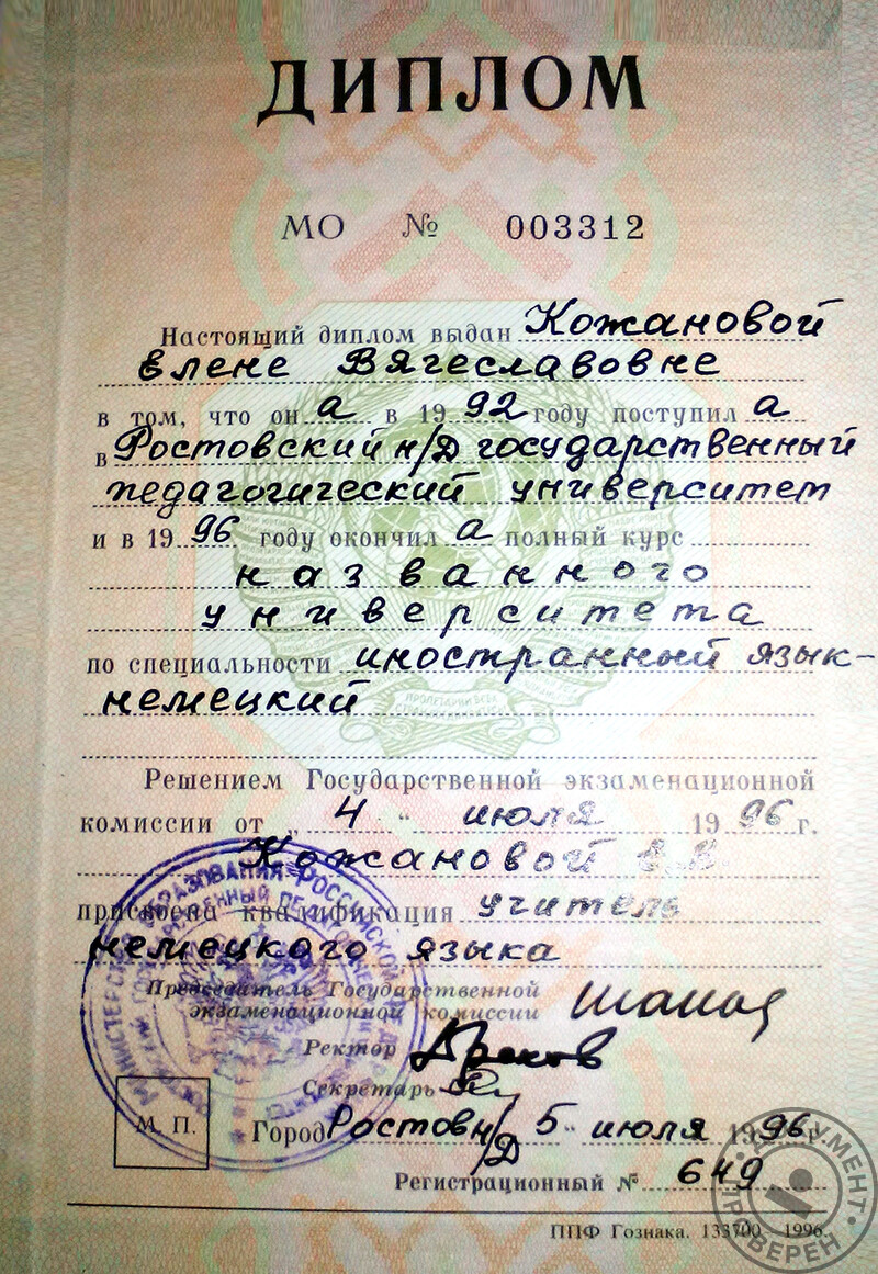 - Ростовский государственный педагогический университет (ЮФУ), факультет иностранных языков, квалификация – преподаватель немецкого языка, 1996 г.