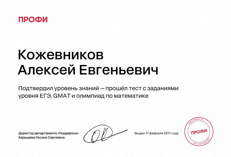 - Подтвердил уровень знаний — Прошёл тест с заданиями уровня ЕГЭ, GMAT и олимпиад по математике (с 2017 г.).