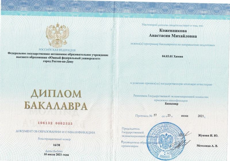 - Южный Федеральный Университет, химия, бакалавр, 2017–2021 гг.