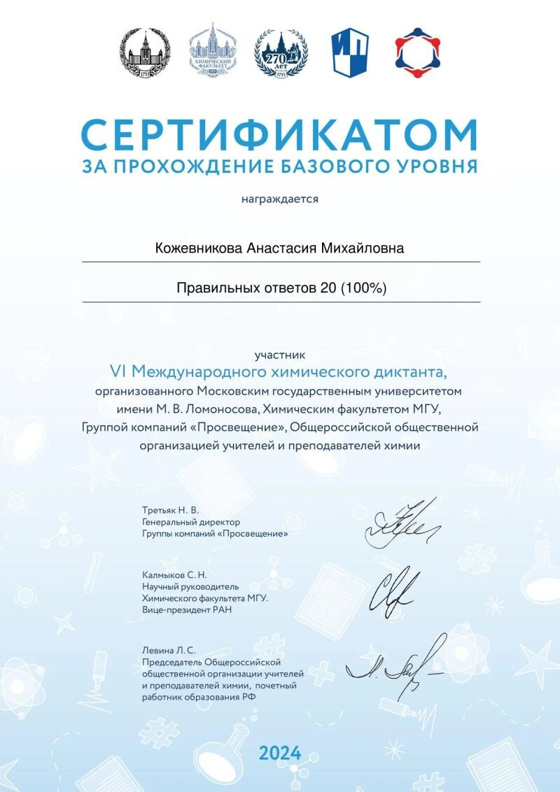 - Московский государственный университет имени М.В. Ломоносова, VI Международный химический диктант, сертификат за прохождение базового уровня, 2024 г.