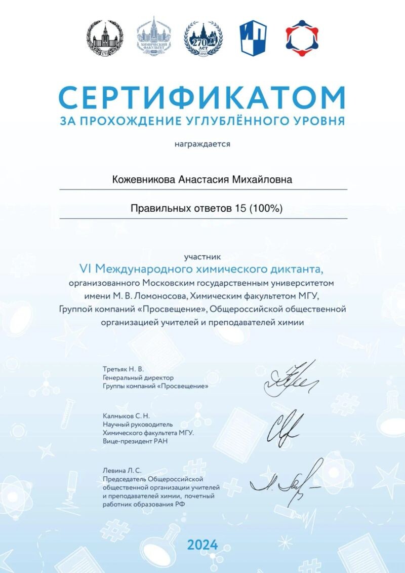 - Московский государственный университет имени М.В. Ломоносова, VI Международный химический диктант, сертификат за прохождение углублённого уровня, 2024 г.