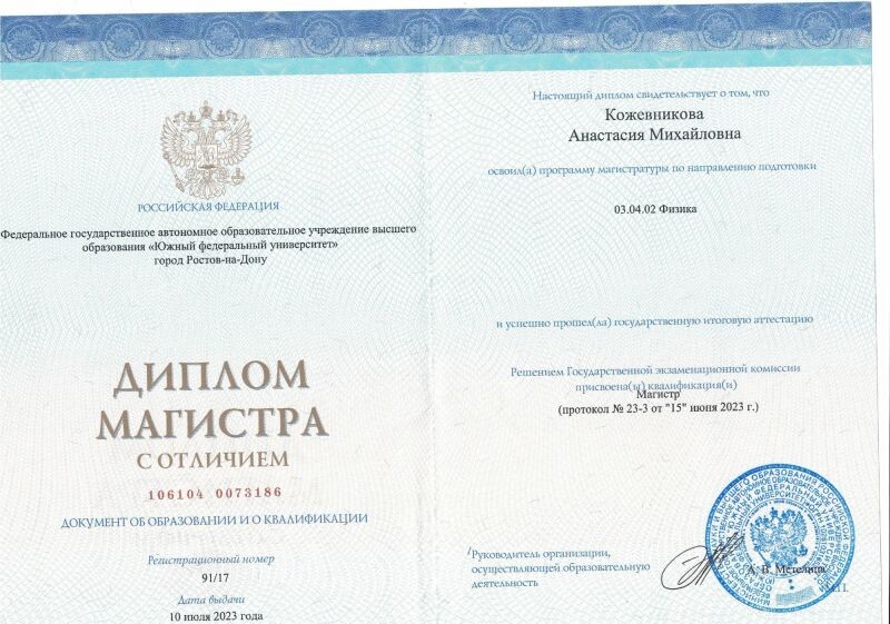 - Южный федеральный университет, физика, магистр, 2021–2023 гг.